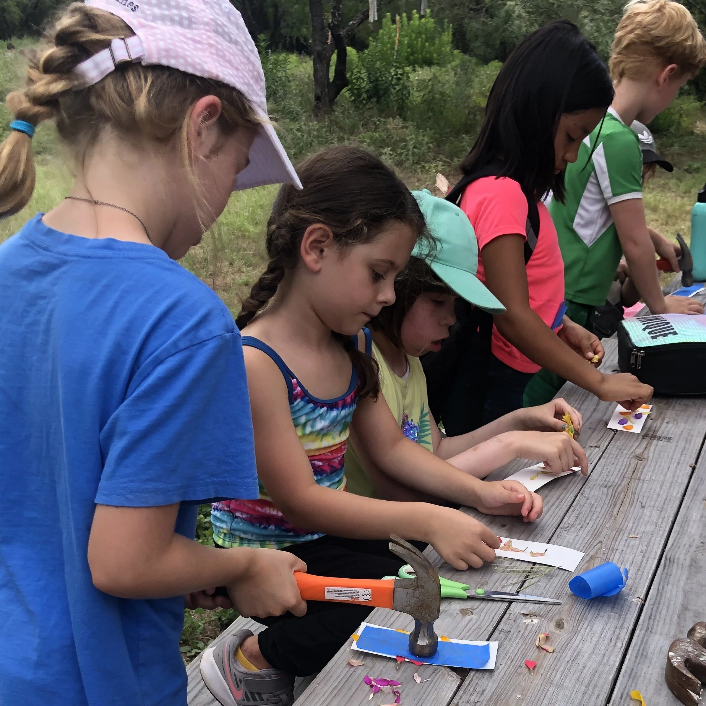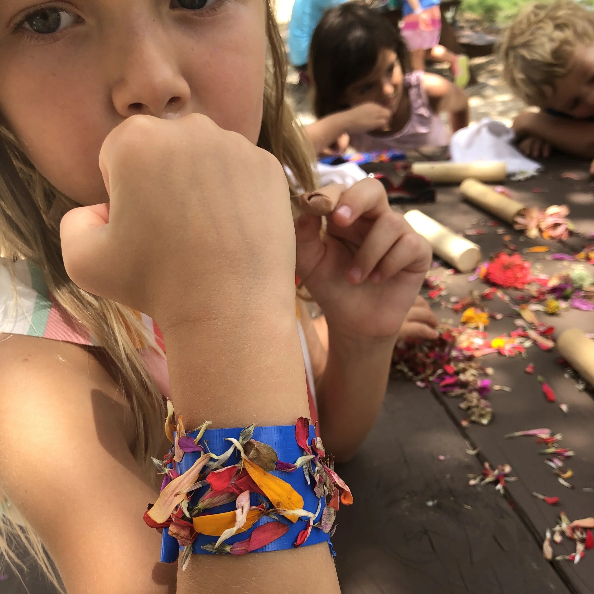 Thursday was a celebration of plant colors. After our farm chores and group games, the Oaks class harvested flowers from the farm. The campers learned all about the colors we get from plants and explored different ways to capture them in art such as pounding them onto fabric and paper for bookmarks, and making lovely flower jewelry. The Oaks group also started a dye pot with orange and purple cosmos. The Willows made delicious flower confetti canapés from edible flowers! More games and water fun at the end of the day.