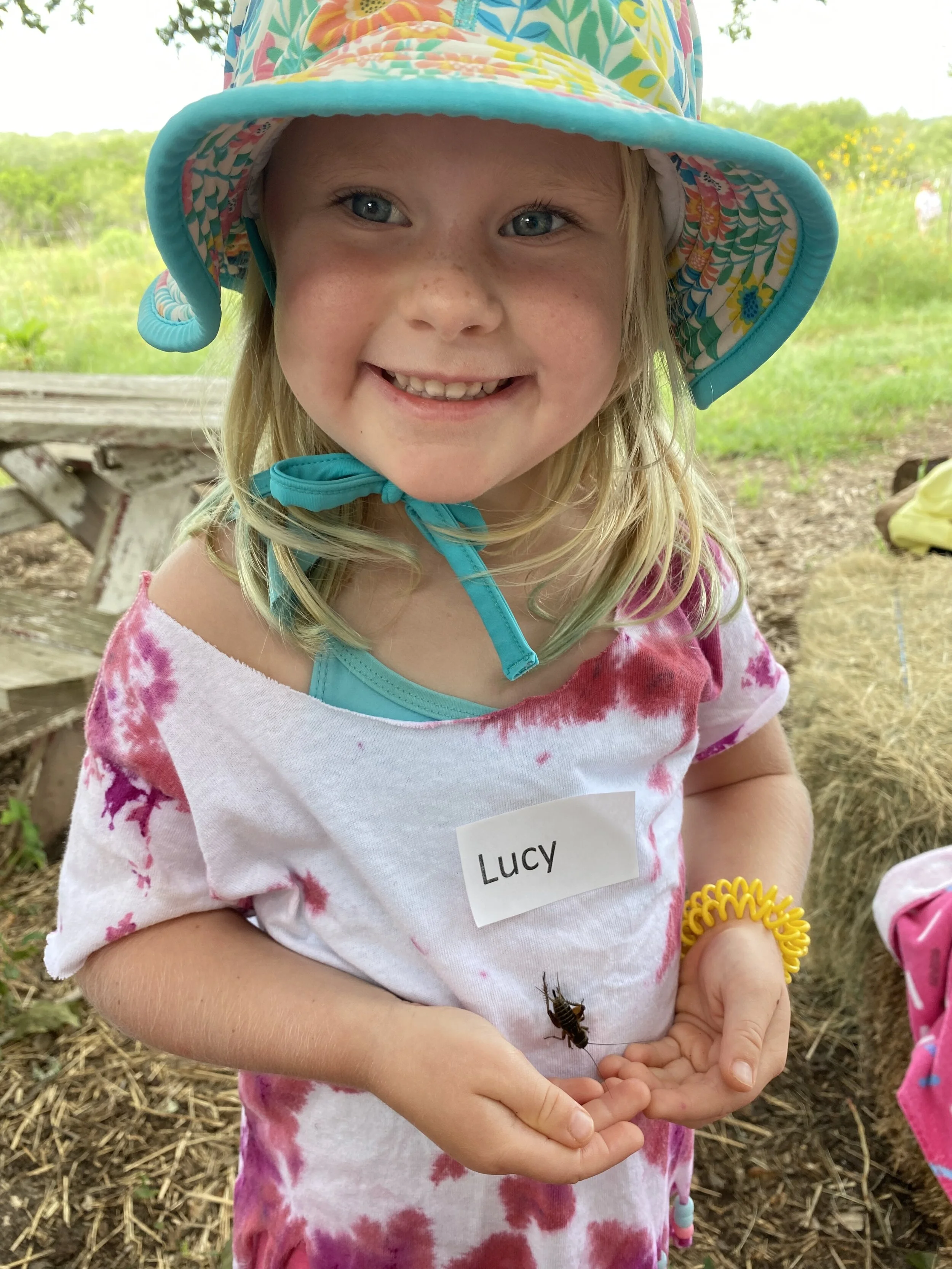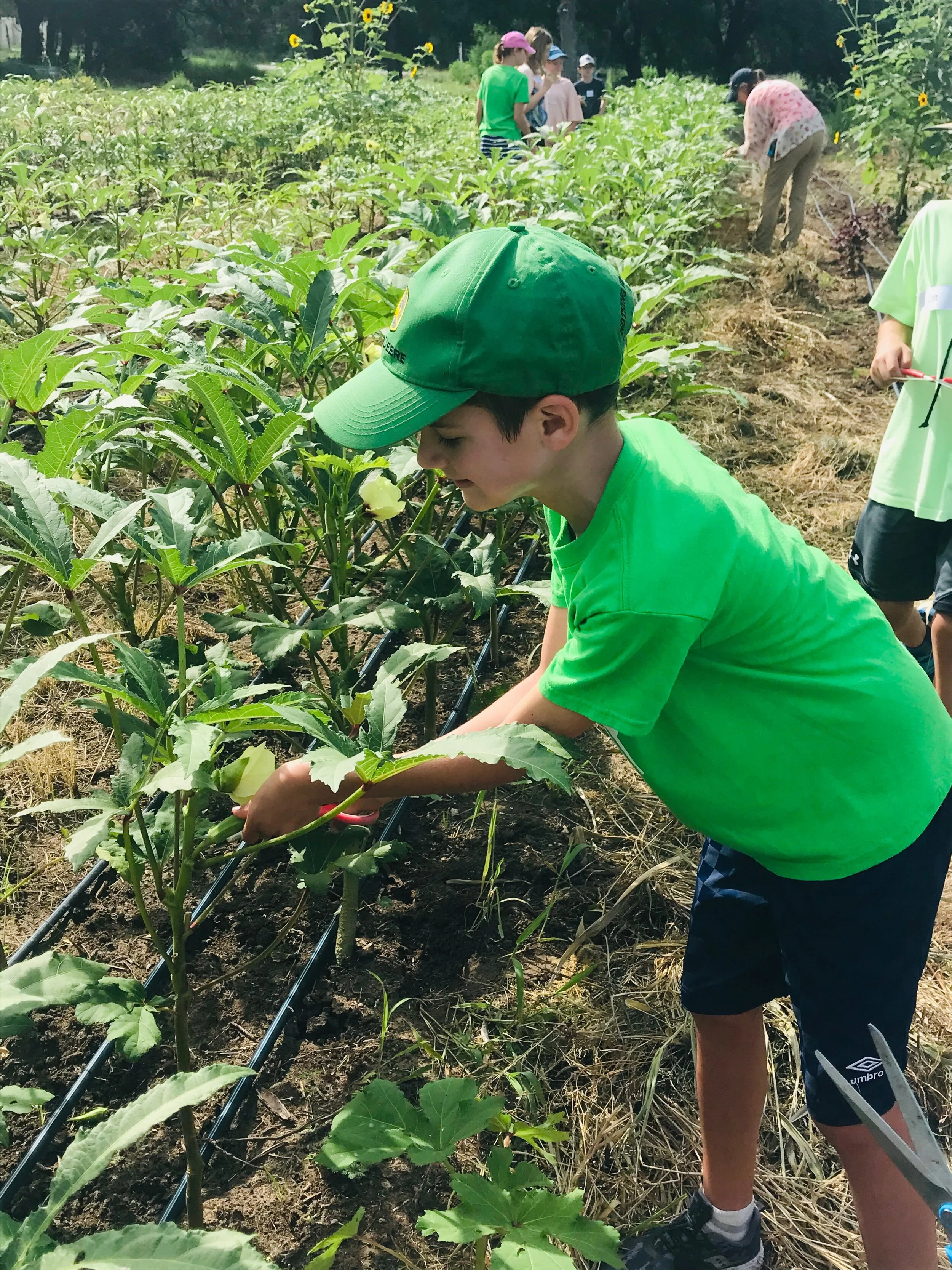 The theme for day two was insects and spiders. After harvesting okra and dill for our farm chores, we learned all about the importance of beneficial insects on our farm (including pollination and predation of harmful bugs that eat our plants.) We then hunted for bugs using magnifying boxes and identified them with our Good Bug / Bad Bug charts. After that, our captured bugs faced intense competition in several bug races. (All contestants were set free.) The Oaks group then made okra pickles and the Willows made a lovely herbal sun tea. We finished at the day with a visit to the cows and plenty of awesome water play.