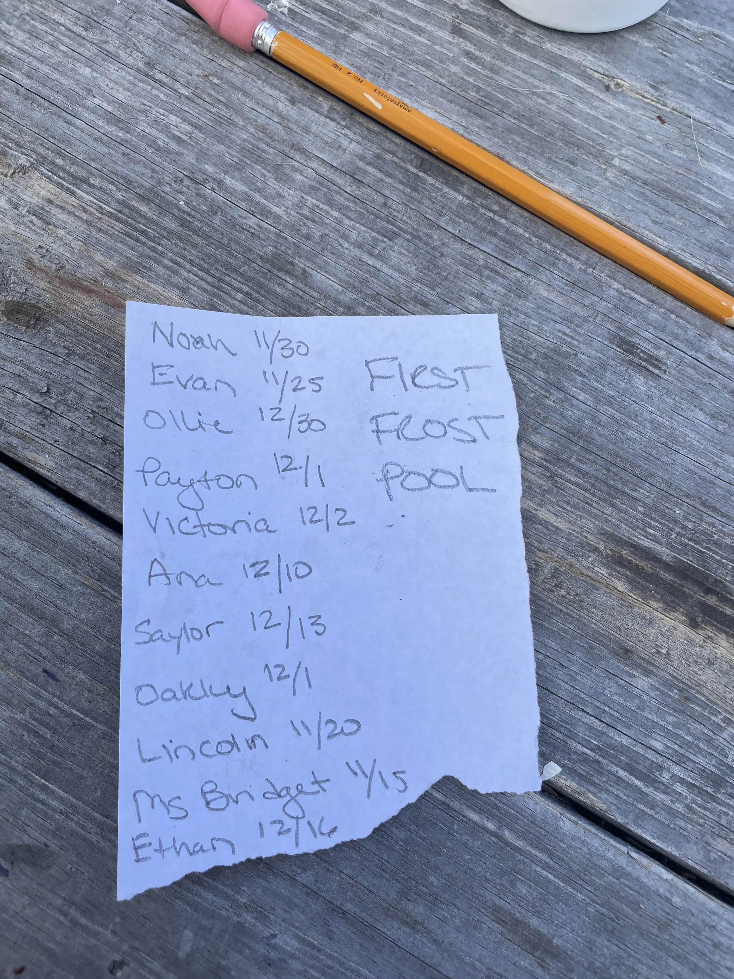 Finally, we created a pool to see who can correctly predict the first frost date (average for Hill Country is November 25th.)